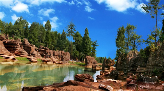 據(jù)地質(zhì)專(zhuān)家考證:紅色石林巖石形成的歷史約4。5億年,地質(zhì)史上稱(chēng)之為揚(yáng)子古海(海底沉積了大量混合泥沙的碳酸鹽物質(zhì),經(jīng)地殼運(yùn)動(dòng)和侵蝕、溶蝕作用形成了這片美麗的地質(zhì)奇觀)。景區(qū)內(nèi)遍布高大奇石,造型各異、顏色變化多端,且隨天氣、時(shí)間、季節(jié)變化而變化,晴紅雨黑、陰轉(zhuǎn)褐紅、晨昏有別。 景區(qū)內(nèi)石景有:蜀犬吠日、乳燕待哺、樓蘭古城、蝸牛搬家、七彩迷宮、利劍刺空、航母巡游、石兵列陣、少女出浴、觀音坐蓮、石鞭候主、靈龜探海、粽熊迎客、天狗吠日、水獺望云、母雞搗窩、駝鈴聲聲····尤以“巨人圓”、“古城故宮”、“八卦奇陣”、“諸葛藏書(shū)”為奇石絕景中的最佳。 景區(qū)內(nèi)還有地下溶洞、絕壁天坑、神秘地坑、千年古木、土家山寨、土風(fēng)民俗、集商遺址····