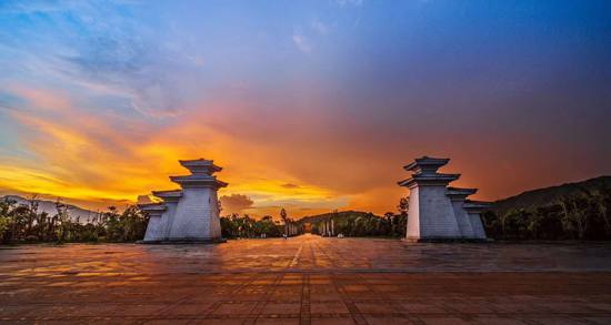 炎帝陵闕門位于公祭區(qū)入口處,2011年5月,該工程榮獲株洲市“十大標(biāo)志性重點(diǎn)工程”,采用最先進(jìn)的石材干掛工藝建造而成。主塔高17.09米,被譽(yù)為“中華第一闕”。沿祭祀大道兩側(cè)立5對五谷柱,高8.79 米,直徑1.2 米,分別雕飾稻、梁、菽、麥、黍圖案。